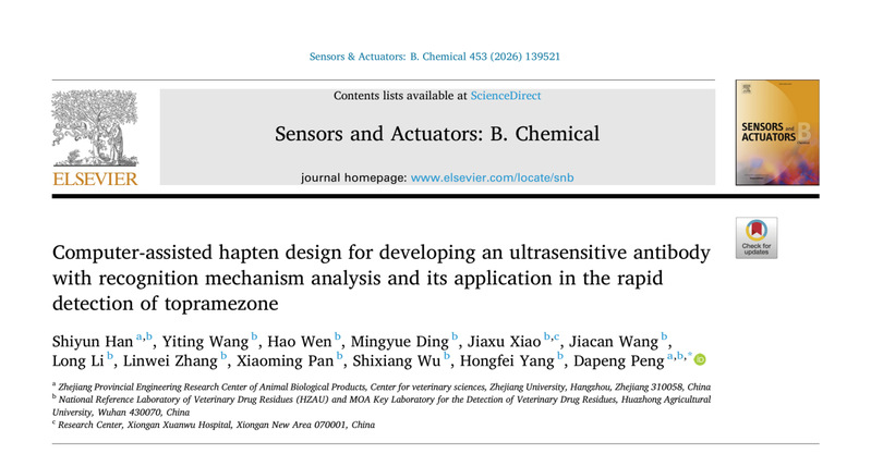 近日,国际权威期刊《Sensors and Actuators: B. Chemical》(Q1,中科院1区Top)发表了题为“Computer-assisted hapten design for developing an ultrasensitive antibody with recognition mechanism analysis and its application in the rapid detection of topramezone”的研究性论文。浙江大学博士研究生韩世赟为论文第一作者,浙江大学彭大鹏教授为论文通讯作者。